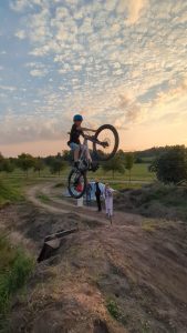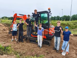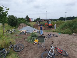 Schon seit Langem hatten sie den Wunsch, ihre kleine Bike-Bahn am Sportplatz weiter auszubauen. Kurzerhand wandten sie sich an den Verein Jugend aktiv e.V. mit der Bitte, den angelieferten Lehm nutzen zu dürfen. Außerdem fragten sie nach einer Motorsense, um den Bewuchs zu entfernen, und nach der Möglichkeit, einen Minibagger für die Umgestaltung zu mieten.
